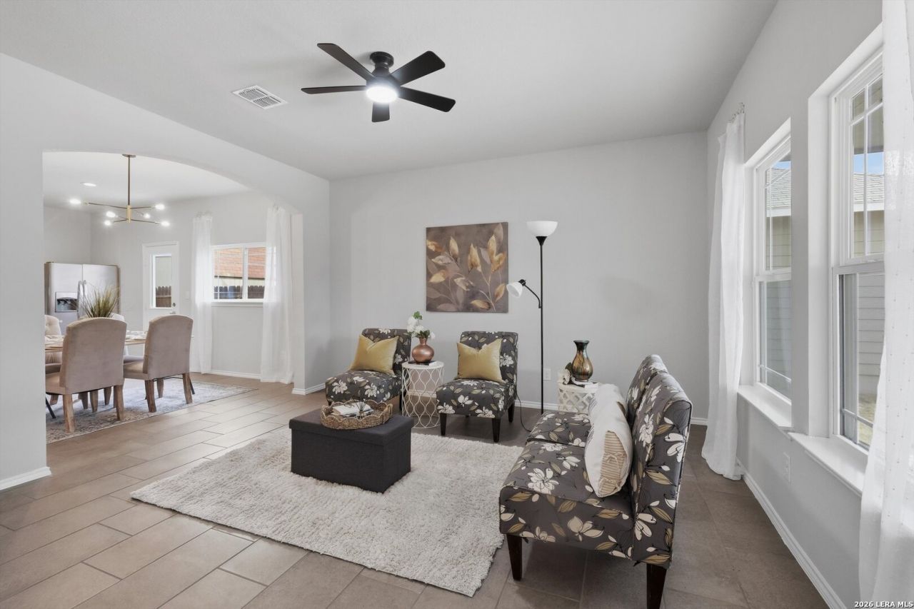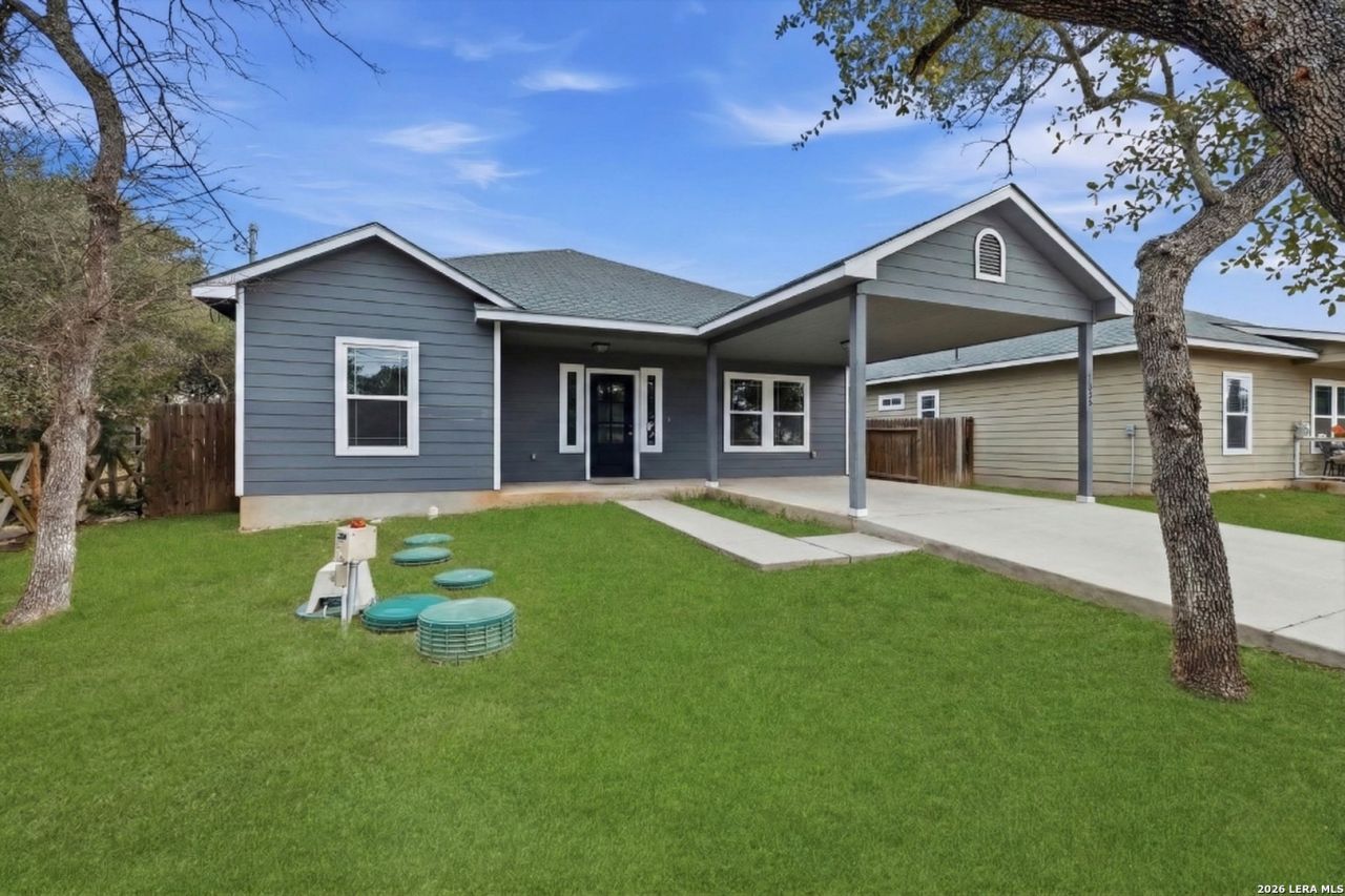Welcome to this thoughtfully designed single-story home in the Cypress Cove community of Spring Branch, ideally located just minutes from Canyon Lake and its many opportunities for boating, fishing, and outdoor recreation. Built in 2020, this 3-bedroom, 2-bath home offers modern finishes and a functional open layout designed for everyday comfort and entertaining. A covered front porch welcomes you inside to a bright living area with high ceilings, large windows, recessed lighting, and a built-in shelving feature wall that adds both character and storage. The open-concept design flows seamlessly into the kitchen and dining space, where granite countertops, a spacious center island, stainless steel appliances, ample cabinetry, and a window over the sink create a welcoming place to gather with family and friends. The primary suite offers a relaxing retreat with a walk-in shower, granite vanity, and generous closet space, while two additional bedrooms provide flexibility for guests, a home office, or hobbies. Tile flooring in the main living areas and wood-look flooring in the bedrooms add durability and warmth throughout the home. Step outside to enjoy the fully fenced backyard with plenty of space for outdoor gatherings, pets, or future landscaping projects. Residents of Cypress Cove enjoy access to neighborhood amenities including a community pool, park, sports courts, and fishing pond, all within the highly regarded Comal ISD. With convenient access to Canyon Lake, nearby boat ramps, and Hill Country recreation, this home is well suited as a full-time residence, weekend getaway, or potential investment opportunity. This is where your next chapter begins!
