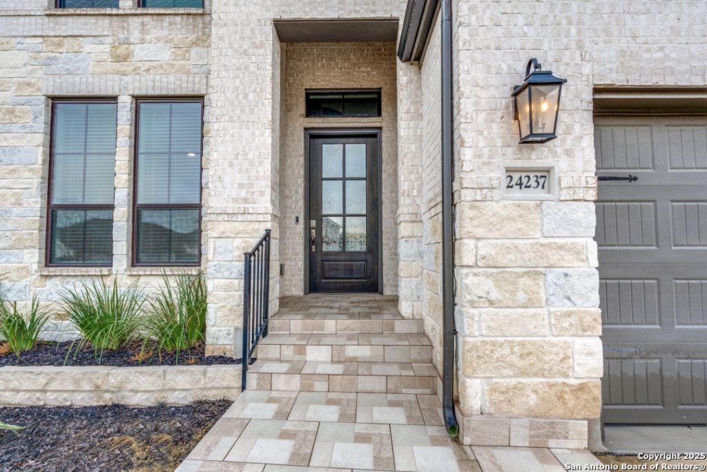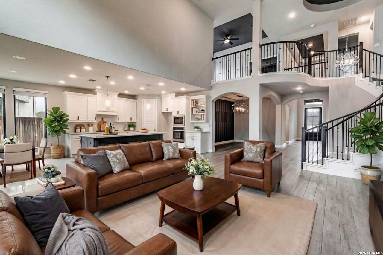 Experience luxury Hill Country living in the highly sought-after Cibolo Canyons community, just minutes from the renowned JW Marriott TPC Golf Resort. This exceptional two-story home offers elegance, comfort, and thoughtful upgrades throughout. A breathtaking curved staircase welcomes you into the grand entryway, with glass French doors leading to a private home office. The formal dining room features a stylish accent wall, adding sophistication and warmth. The spacious family room showcases a soaring two-story ceiling, a striking accent wall, expansive picture windows that fill the home with natural light, a wood-mantel fireplace, and sliding glass doors that create seamless indoor-outdoor living. The chefs kitchen is designed for both beauty and function, featuring a large island with breakfast bar, upgraded countertops, and a 5-burner gas cooktop. Retreat to the luxurious primary suite with a 12-foot ceiling and a spa-inspired bath offering dual vanities, a garden tub, a separate glass-enclosed shower, and a walk-in closet upgraded with custom shelving and direct access to the utility room. A secondary bedroom with full bath serves as a convenient downstairs guest suite. Every room in the home is enhanced with added ceiling fans, ensuring comfort year-round. Step outside to an upgraded patio with stunning pavers, perfect for relaxation or entertaining. Additional exterior features include added gutters and access to over 6 miles of dog-friendly walking paths throughout the community-ideal for morning walks or evening strolls. The property also includes a functional mud room off the spacious 3-car garage with extra storage space, and the added benefit of no city taxes. Located in the beauty of the Hill Country with incredible views, exceptional amenities, and proximity to world-class golf and resort living, this home offers an unmatched lifestyle. Dont miss this opportunity-upgrades, comfort, and elegance abound in every corner.