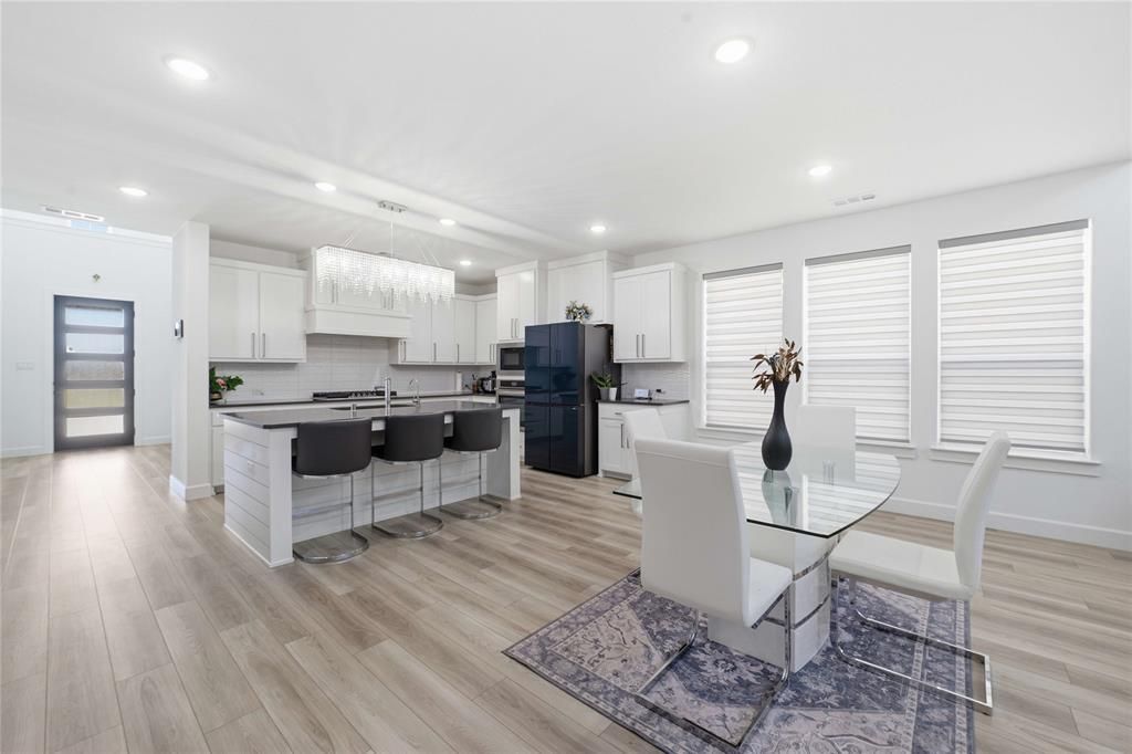 Welcome to this beautifully designed home in the heart of Celina, where style meets functionality. Vaulted ceilings and second-story transom windows fill the interior with natural light, while a striking accent wall creates a warm, inviting first impression. The thoughtfully designed open-concept layout offers seamless flow between the living, dining, and kitchen areas—perfect for both everyday living and effortless entertaining.The kitchen is a true centerpiece, featuring a custom backsplash, ample cabinetry, generous workspace, and high-end Frigidaire appliances. Upgraded decorative lighting throughout the home adds elegance and personality to each space. A dedicated study provides the ideal work-from-home setup, while a secondary bedroom downstairs with an adjacent full bath offers flexibility for guests or multigenerational living.Upstairs, one bedroom features a private ensuite bath, while another is conveniently located near a full bath. The media room is designed for an immersive experience, with furniture and equipment negotiable, including a short-throw projector, 150 inch screen, 7.2 surround sound system, and theater seating—everything needed to create your own home theater. A Samsung refrigerator, washer, dryer, and household TVs are also negotiable.Additional upgrades include an epoxied garage floor with added storage, EV charging plug, and electric blinds along the rear and side of the home. Step outside to an extended, partially covered patio plumbed for gas, ideal for grilling and outdoor entertaining. The spacious backyard provides plenty of room to relax, play, or host gatherings.With its modern upgrades, versatile layout, and thoughtful design throughout, this home offers the perfect blend of comfort, convenience, and sophistication in one of Celina’s most desirable neighborhoods.