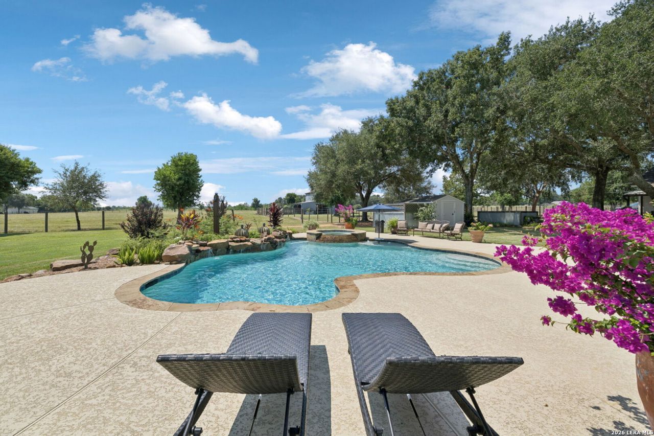 Welcome to your slice of Texas paradise! This stunning 3-bedroom, 2-bathroom ranch sprawls across 15 acres where tranquility meets functionality. The star of the show? A magnificent 1/3 acre pond stocked with over 100 catfish, complete with a dock for those lazy afternoon fishing sessions. Inside, vaulted ceilings soar above wood floors, while dual living areas offer flexibility - one featuring a clever Murphy bed for guests. The gourmet kitchen boasts custom cabinetry and stainless appliances, perfect for entertaining. An upstairs craft room provides creative sanctuary. Outside, dive into resort-style luxury with a stunning pool, natural rock waterfall, and hot tub surrounded by meticulous landscaping. The property includes an 1,200 square foot air-conditioned outbuilding with full kitchen - ideal for gatherings or the ultimate retreat. Adjacent sits a 3,600 square foot shop with 4 overhead doors, plus equipment and hay barns. Cross-fenced pastures complete this agricultural paradise.