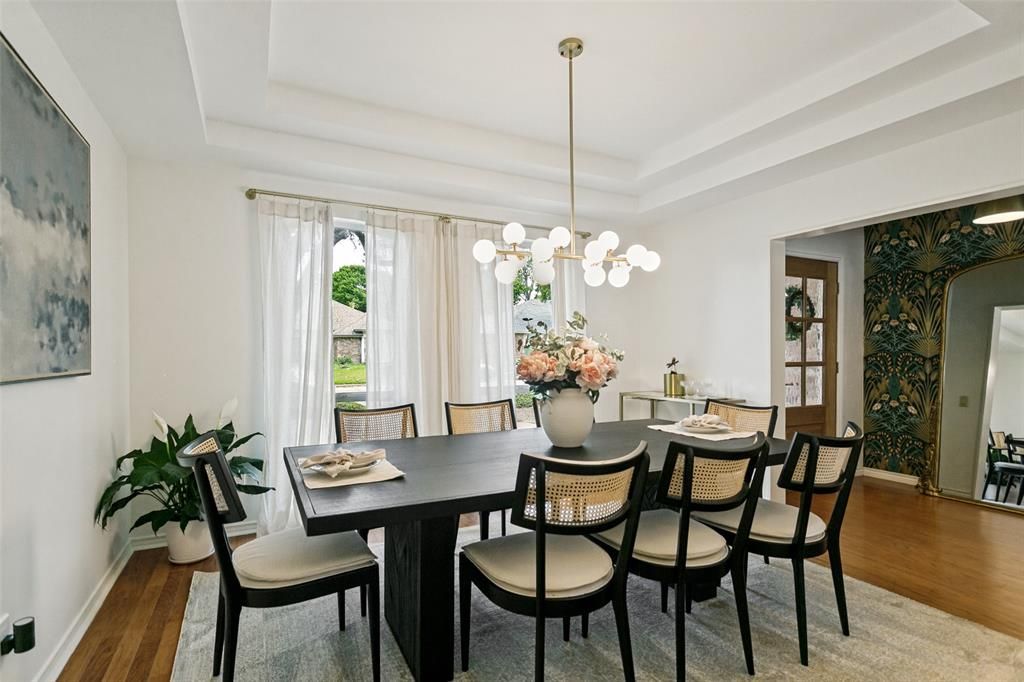 Updated one-story ranch in the heart of Plano with a split floor plan, wood floors, new carpet, replaced windows, custom window coverings, and a huge backyard with pool and spa.The grand living room features a brick fireplace, coffered ceiling, built-in bookshelves, and a wall of windows overlooking the backyard. The primary suite also enjoys backyard views and access, along with a tiered ceiling, new ceiling fan, and a beautifully updated bath with dual vanities, leathered countertops, framed mirrors, separate tub, walk-in shower, and striking tile work. The slab granite kitchen offers double ovens, built-in stainless microwave, refaced cabinetry with updated hardware, bar seating, and an adjoining breakfast nook surrounded by windows and backyard views. Secondary bedrooms feature ceiling fans and walk-in closets with built-ins, while both secondary baths have been updated with granite countertops and tiled seamless-glass showers. Outside, the oversized covered patio with ceiling fan, wired for flat screen TV and overlooks the pool, spa, and generous grassy yard. Just minutes from 190-GBT, 75-Central, and DNT, and only steps from Wells Elementary and Buckhorn Park.